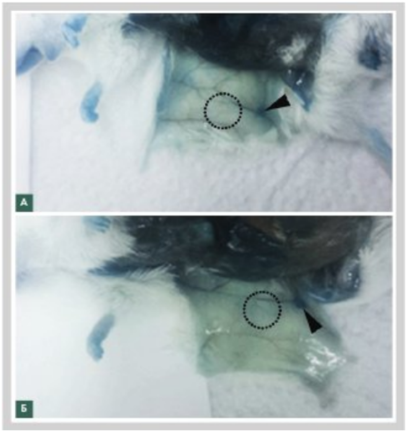 Fig. 2. Detection of IHS in ACA reaction after sensitization of Balb/c mice with «COLLOST® micro» (A) and «COLLOST® intense» (Б) medical devices. The dotted line marks the areas of the RD injection. Arrows indicate the inguinal lymph nodes (blue coloring indicates the presence of Evans blue dye in the bloodstream)