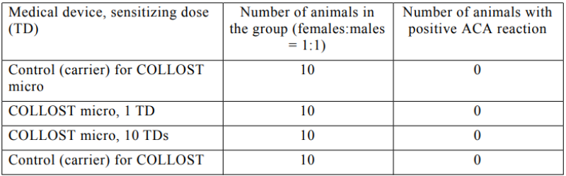 GOST R ISO 10993-10-2011 does not describe methods for studying IHS that include sensitization using intradermal or subcutaneous injections. In this regard, the ACA method, widely used in preclinical studies of medicinal products, was used to assess the ability of the medical devices to induce IHS [2]. Results of in vivo experiments conducted did not reveal the development of IHS and DHS reactions in any of the animals in the experimental groups that received either “Collagenbased intradermal implant COLLOST® micro” or “Collagen-based intradermal implant COLLOST® intense”.