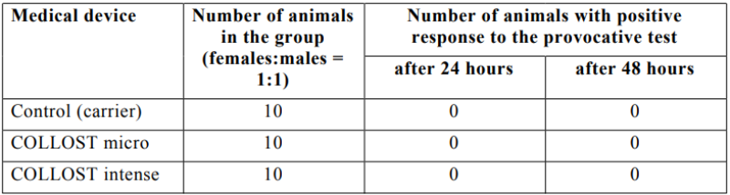 The medical devices “Collagen-based intradermal implant COLLOST® micro” or “Collagenbased intradermal implant COLLOST® intense” do not have a sensitizing effect in the preclinical models in vivo. The data obtained support safety of the injection implants studied.