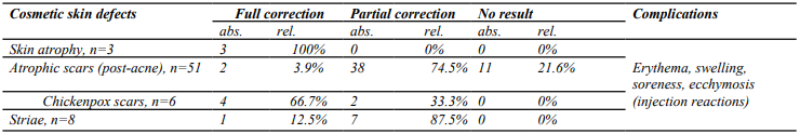 The course of treatment consisted of 3 to 8 sessions (1.5–12 months) with a frequency of administration of once every 3–6 weeks. Number of sessions and the frequency of administration of the product were determined individually depending on the severity of atrophic defects and the rate of regression of the clinical effect. Typically, the first three sessions are carried out once every 2-3 weeks, and starting from the 4th session – once every 4-6 weeks. Already after the 3rd session, a significant reduction in the volume of the preparation required to achieve complete correction of the cosmetic defect is observed.