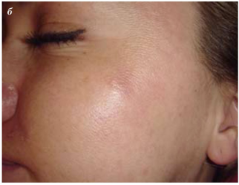 Photo 4. Patient B., 33 years old, skin atrophy after the introduction of diprospan: before treatment (a); after three injections of COLLOST® gel 7 % (b).
