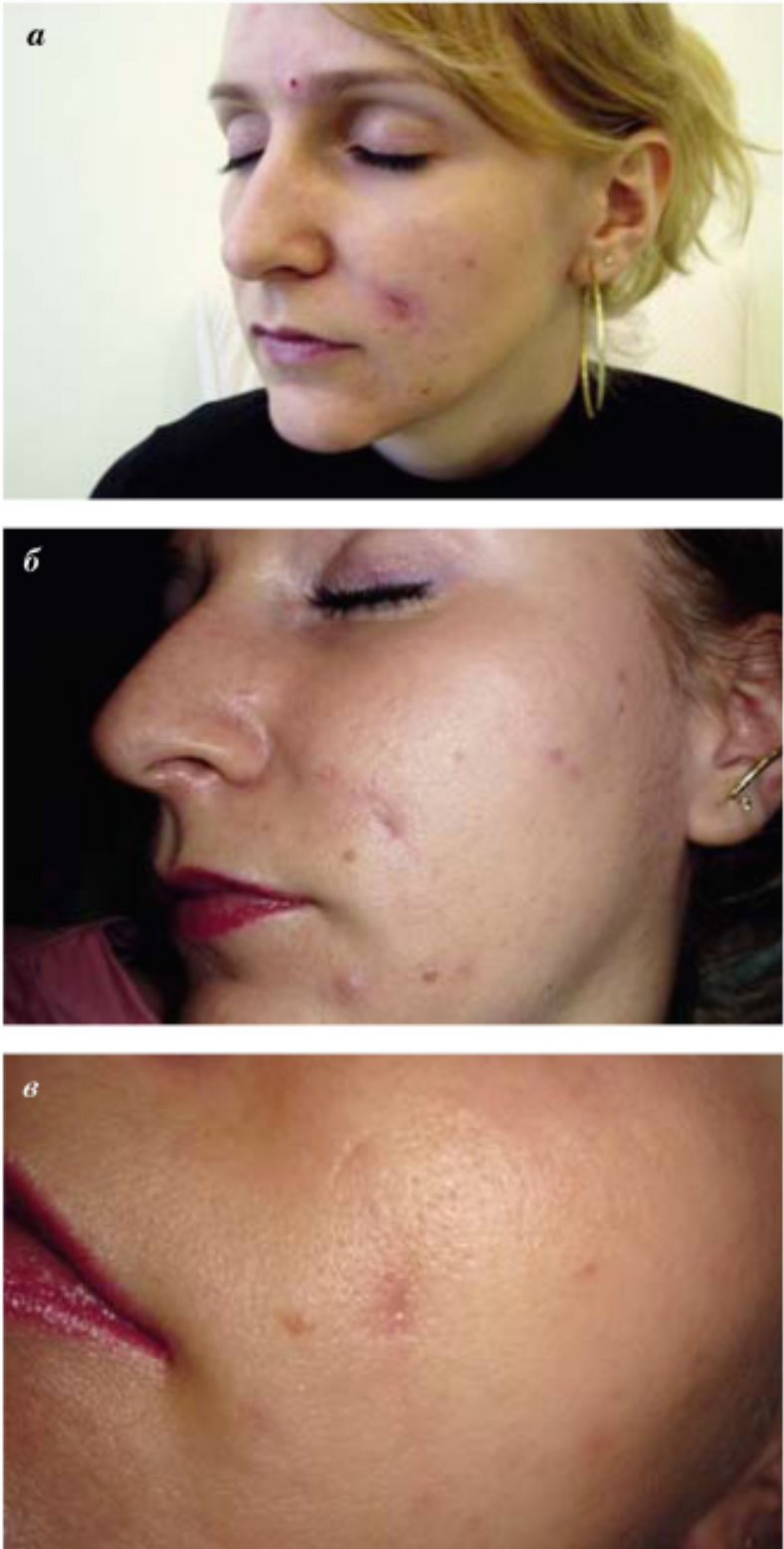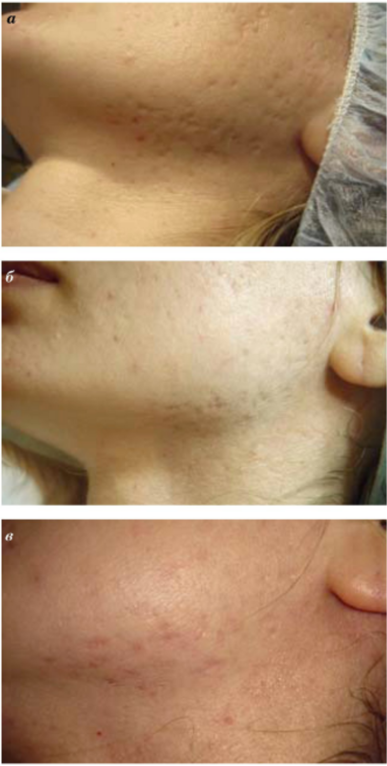 Photo 6. Patient M., 30 years old, post-acne: before treatment (a); after three correction sessions (b, c)