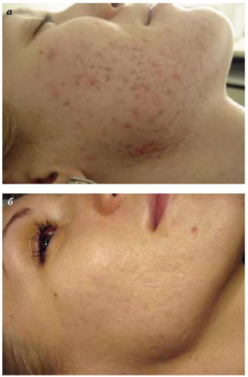 Photo 7. Patient A., 35 years old, acne vulgaris: cheek area before correction of atrophic changes in the skin (a); after 7 sessions of administration of COLLOST® gel 7 % (b)